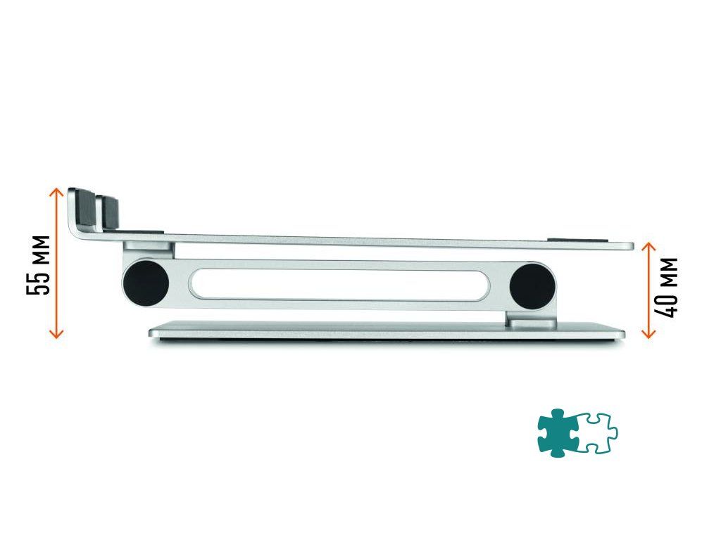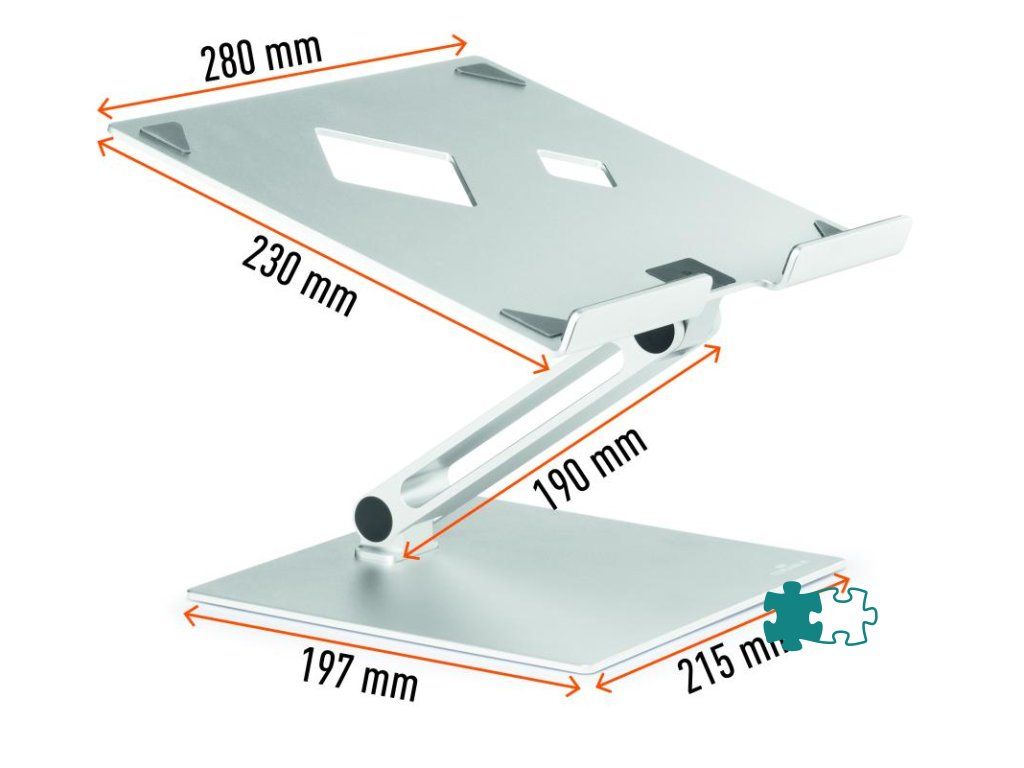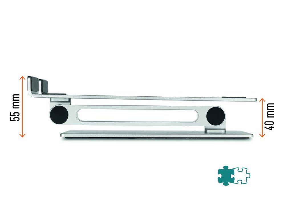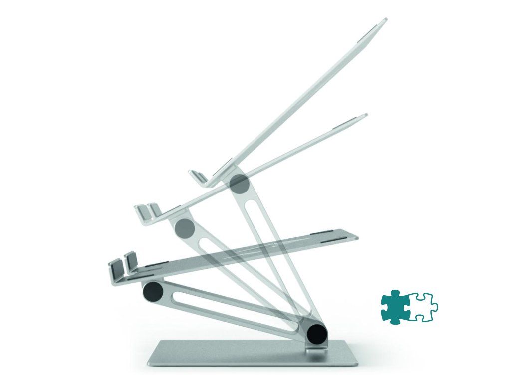Univerzálny nastaviteľný stojan na stôl pre notebooky a tablety od 10” do 17”. Uľahčuje prácu vďaka ergonomickej a flexibilnej nastaviteľnosti výšky a uhla sklonu. Umožňuje používanie notebookov ako stolových monitorov (v kombinácii s externou klávesnicou a myšou). Vysoko stabilný pre bezpečnú prácu. Protišmykový gumený povrch chráni zariadenie pred poškriabaním. Mimoriadne robustný.Dodatočné parametre