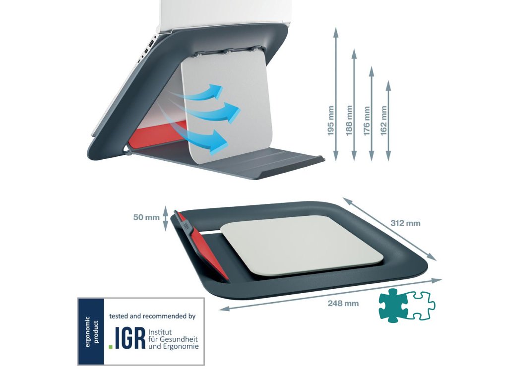 Ergonomicky navrhnutý stojan na notebook pre maximálne pohodlie pri práci. Ideálny na prácu posediačky alebo postojačky pri výškovo nastaviteľnom stole, čo ešte viac zlepšuje celkové zdravie a pohodu Nastavte výšku tak, aby bola obrazovka notebooku v ideálnej pozícii na sledovanie Stojan na notebook udržiava batériu a ostatné komponenty v perfektnom stave vďaka chladeniu prúdením vzduchu Rýchle a jednoduché individuálne prispôsobenie stojana na notebook, štyri rôzne výšky na výber Vďaka kompaktnému dizajnu a podstavcu je ideálnym doplnkom každého pracovného stola Keď ho nepoužívate, jednoducho ho zložíte Gumové prvky a integrovaný držiak poskytujú bezpečné a stabilné uchytenie vášho notebooku, aby zostal pevne na svojom mieste Vhodné pre notebooky od 13` do 17`. Tento výrobok by sa mal používať s externou klávesnicou a myšou (predáva sa samostatne) Kolekcia Leitz Cosy Ergo spája štýl s prvotriednou kvalitou na vytvorenie zdravého a aktívneho pracovného prostredia. Farba sivá.Dodatočné parametre