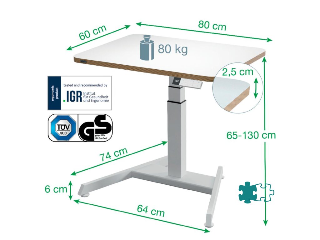 SEDIEŤ - ŠTÁT - HÝBAŤ SA. Či už sa usilujete o zdravší pracovný režim alebo hľadáte ergonomické riešenie, ako sa vyhnúť bolestiam, naše priestorovo úsporné stoly sú navrhnuté tak, aby pozdvihli váš pracovný priestor do nových výšin.Elektrický stôl na sedenie/státie s kompaktnou stolnou doskou (80 x 60 cm)