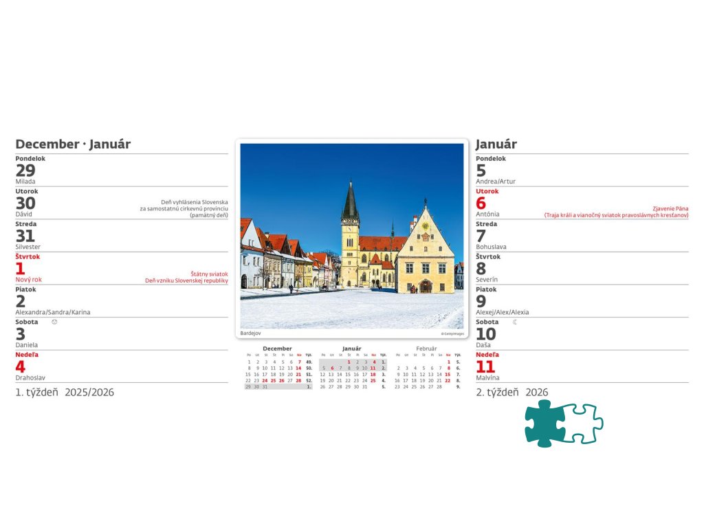 Stolový kalendár riadkový 32,1x13,4 cm - Mestá Slovenska 2026
