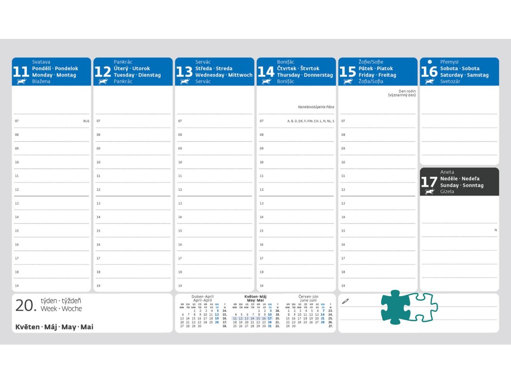 Formát: 30,1 x 18 cmKalendárium: české/slovenské týždenné stĺpcové + AJ + NJ