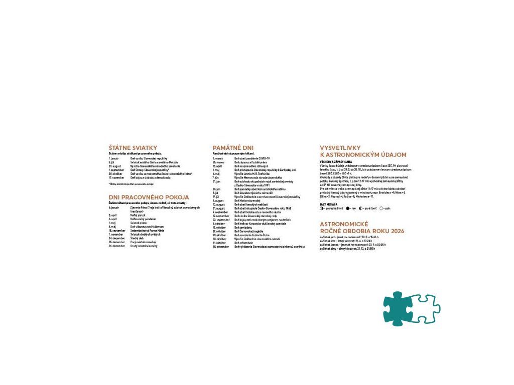 Spoznajte krásy Slovenska prostredníctvom stolového kalendára Slovensko. Týždňový stĺpcový kalendár s hodinovým delením, daňovými pripomienkami, fázami Mesiaca, východmi a západmi Slnka, štátnymi sviatkami všetkých krajín EÚ, školskými prázdninami, slovenskými a českými menami (plus netradičné mená).Formát: 300 × 120 mm