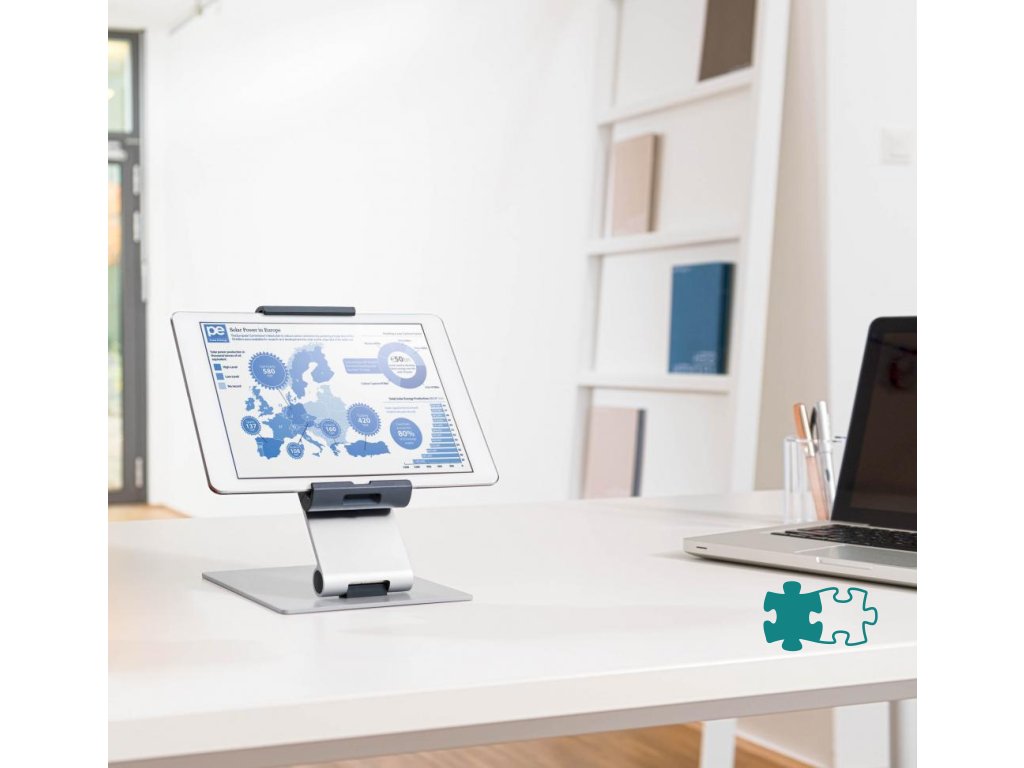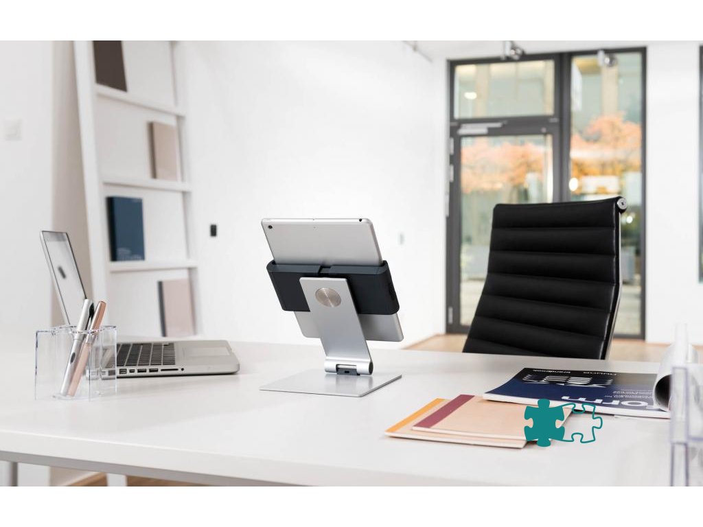 Rotačný stojan 360 ° na stôl na tablety od 7 do 13 ` na výšku alebo na šírku s jednoduchým vkladaním a vyberaním tabletu. Uchytávacie body po 90 °, ochrana pred bočným vybratím tabletu, premenlivý uhol sklonu ramena od 0 ° do + 88 °, symetrické otváranie držiaka od 160 do 275 mm. Otvor v stojane slúži ako výstup pre nabíjací kábel. Uzamknutie držiaka pomocou špeciálneho kľúča. Materiál hliník, ASB a oceľový plech. Dodatočná ochrana proti krádeži pomocou káblového zámku (nie je súčasťou balenia). Rozmery 155 × 242 × 183 mm.Dodatočné parametre