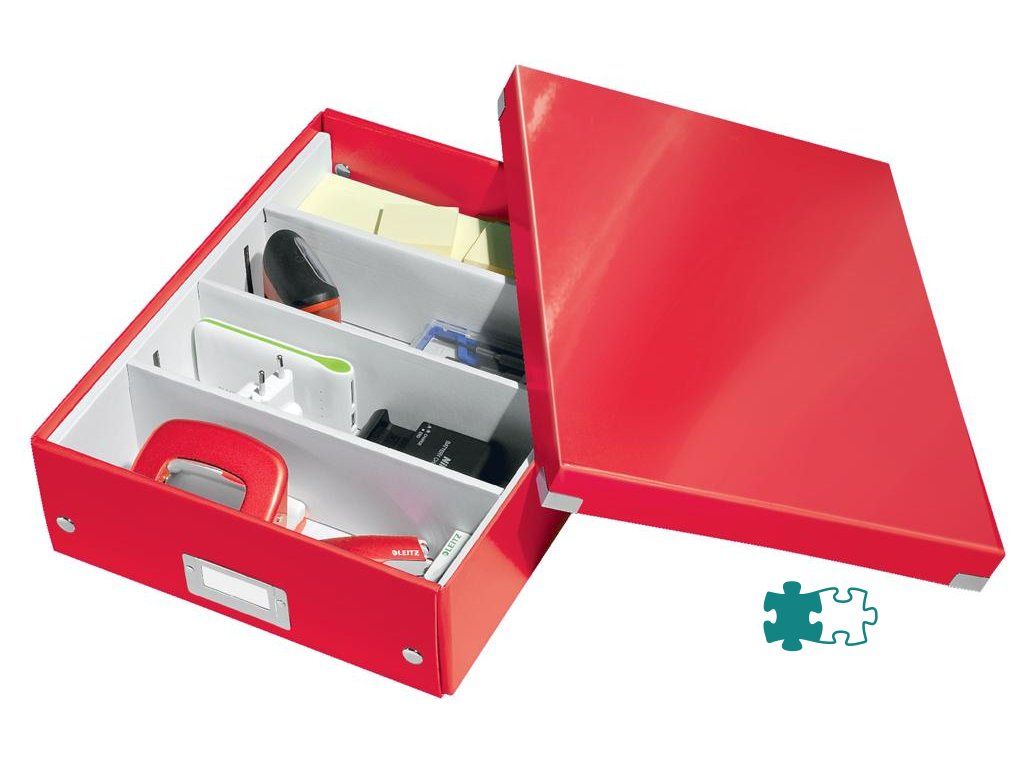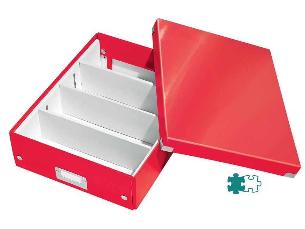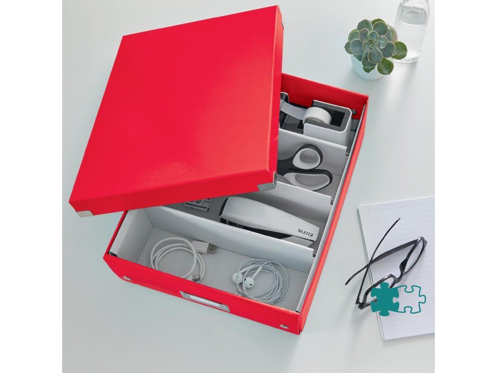 Archivačná krabica s vekom vo výrazných farbách WOW. Pevné a stabilné prevedenie. Materiál silný drevnatý kartón potiahnutý laminom. Rámik na štítok, vystužené rohy krabice a spojovacie cvoky vyrobené z kovu. Inteligentná skladacia konštrukcia - rýchle a jednoduché zloženie bez nutnosti použitia skrutiek a opätovné rozloženie, keď krabice práve nepoužívate. Dodávané rozložené. Väčšie balenie 6 ks. Krabica na usporiadanie káblov, nabíjačiek, slúchadiel, fotografi í a ďalších drobností. Na vylepšenie usporiadania obsahu slúži vnútorný systém priehradiek, s ktorým môžete rozdeliť krabicu na 2 alebo 3 časti a zabrániť tak miešaniu obsahov v jednotlivých častiach. Veľkosť M. Robustné kovové úchyty na jednoduchý prenos. Rozmery 280 × 100 × 370 mm.Dodatočné parametre