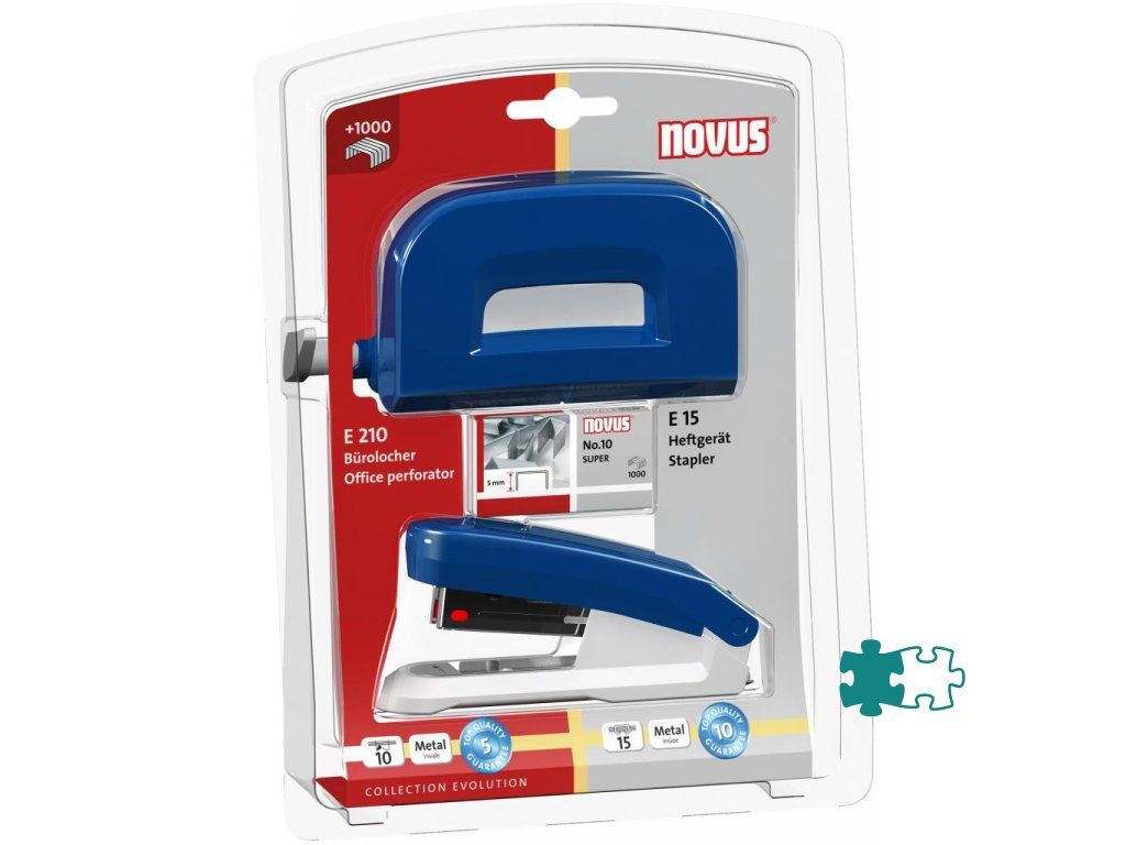 Ľahká praktická kancelárska zošívačka a dierovačka z kolekcie Evolution, dodávaná so spinkami. Zošívačka má vrchný diel z plastu a integrovanú kovovú rozošívačku na zadnej časti. Kapacita náplne 100 spiniek veľkosti No.10. Hĺbka zošívania 3,7 cm. Dierovačka má kovovú základňu, plášť v plastovo-kovovom prevedení a posuvné pravítko. Rozpätie dier 8 cm. Farba modrá/sivá.Dodatočné parametre