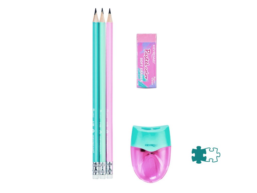 Súprava pastelových grafitových ceruziek KEYROAD, 5 ks: grafitová ceruzka trojuholníková, s gumou 3 ks, strúhadlo plastové dvojité, s nádobkou 1 ks, mäkká guma 1 ks. Balenie: blister. Farba: mix farieb.Dodatočné parametre