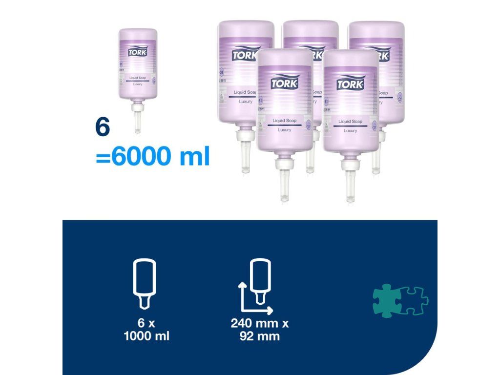 Jednorazová náplň luxusného tekutého mydla vhodná do dávkovačov TORK, ktoré sú overené ako ľahko používateľné a všetkým užívateľom poskytujú správnu hygienu rúk. Doprajte návšteve sviežu jazmínovú vôňu Tork. Výnimočné zloženie s jedinečnou vôňou a bohatými odtieňmi orgovánu obsahuje tiež výťažok z hodvábu, ktorý zanechá na vašej pokožke pocit jemnosti. Luxusná jazmínová vôňa, obsahuje 1 000 dávok. Objem 1000 ml.