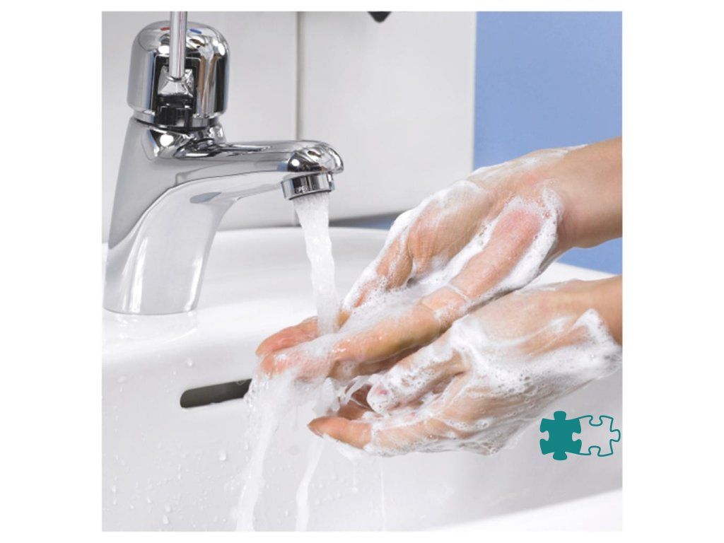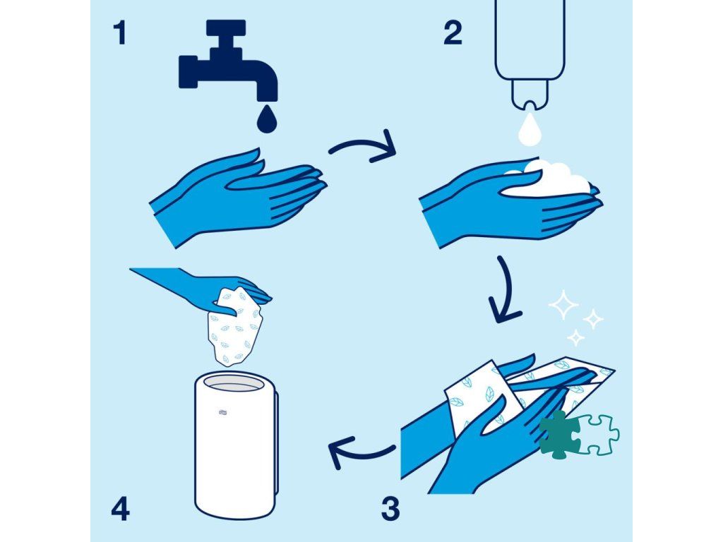 Z dávkovača vypusťte mydlo na mokré ruky, vytvorte penu, opláchnite a osušte jednorazovou papierovou utierkou.