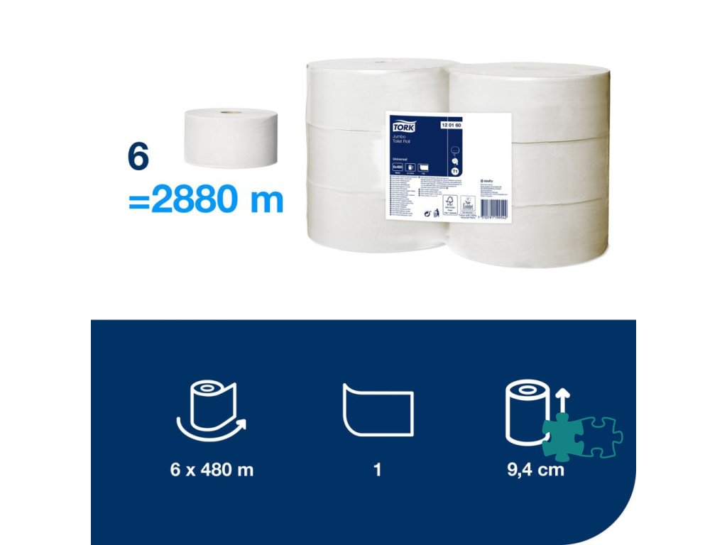 Tork Jumbo ponúka oveľa väčšie množstvo toaletného papiera ako štandardný kotúč. Tork Jumbo toaletný papier v kotúči Universal jednovrstvový spĺňa základné potreby toaliet a umyvární a je ideálny pre vysoko frekventované prostredia. V predaji po balení (6 roliek).-Vysoká kapacita: menej údržby a znížené riziko, že sa utierky minú