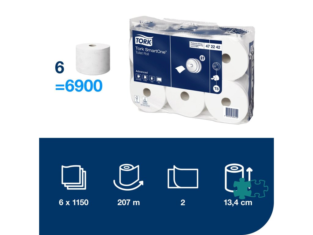 Tork SmartOne systém toaletného papiera v kotúči vydáva jeden hygienický list papiera naraz, čím pomáha znižovať spotrebu až o 40 % v porovnaní s tradičnými automatickými kotúčmi Jumbo. Tork SmartOne Mini sú vysokokapacitné kotúče, ktoré sú vhodné pre náročné toalety a umyvárne od nízkej, strednej až po vysokú návštevnosť v závislosti od toho, ktorý Tork SmartOne Mini zásobník si vyberiete. V predaji po balení (6 roliek).-Rýchly rozpad a znížená spotreba minimalizuje riziko upchatia potrubia