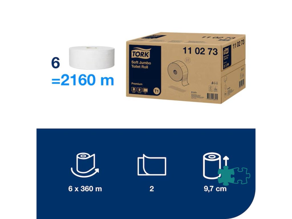Tork Jumbo systém je časovo efektívny a znižuje náklady, ponúka oveľa väčšie množstvo toaletného papiera ako štandardný kotúč. Tork Jumbo jemný dvojvrstvový toaletný papier v kotúči Premium ponúka výnimočný vzhľad a pocit spolu s výbornou kvalitou a je vhodný do vysoko frekventovaných prostredí. Mäkký hygienický papier s vysokým jasom zanecháva dlhotrvajúci dojem.Dĺžka kotúča: 360 m
