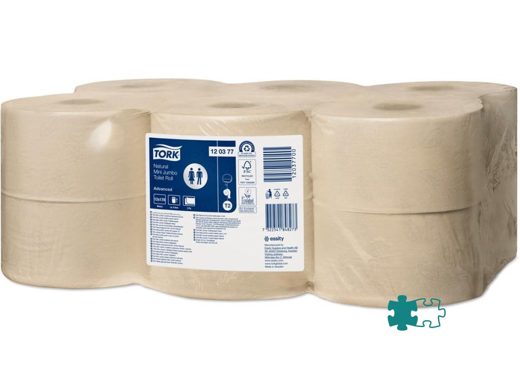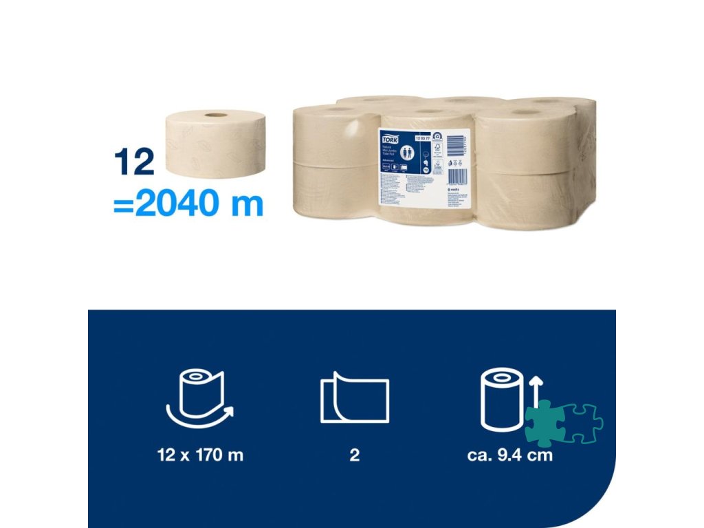 Tork Mini Jumbo systém je časovo efektívny a znižuje náklady, pričom ponúka oveľa väčšie množstvo toaletného papiera ako štandardný kotúč. Tork Mini Jumbo toaletný papier v kotúči Advanced dvojvrstvový výborne vyvažuje náklady a potrebný výkon a je ideálny pre stredne až vysoko frekventované prostredia. Hygienický papier je vyrobený zo 100 % recyklovaných vláken.Dĺžka kotúča: 170 m