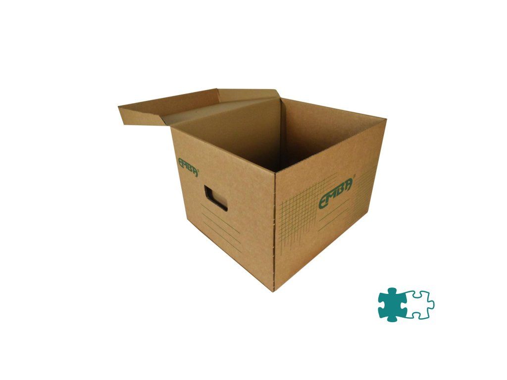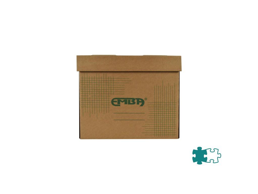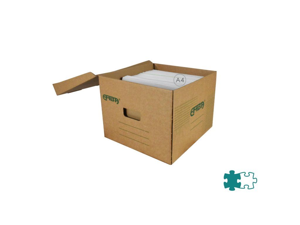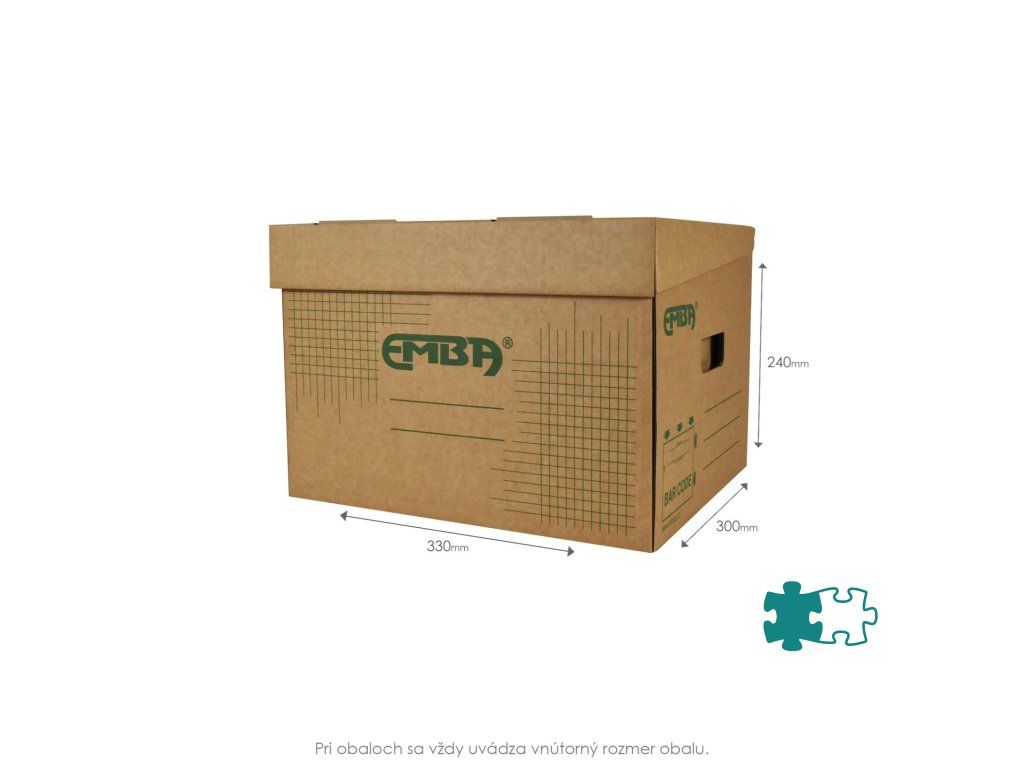 Úložná škatuľa s výklopným vrchnákom z hnedej vlnitej lepenky so zelenou potlačou. Určená na uloženie voľne vložených spisov formátu A4. Rozmery š330xd300xv240 mm.Dodatočné parametre