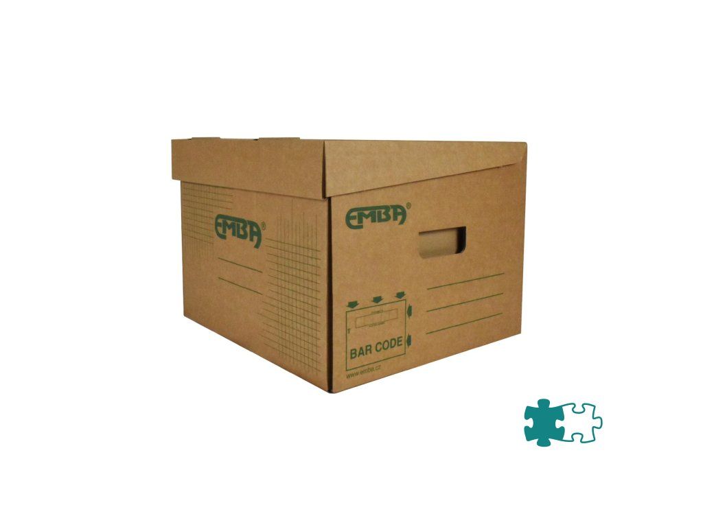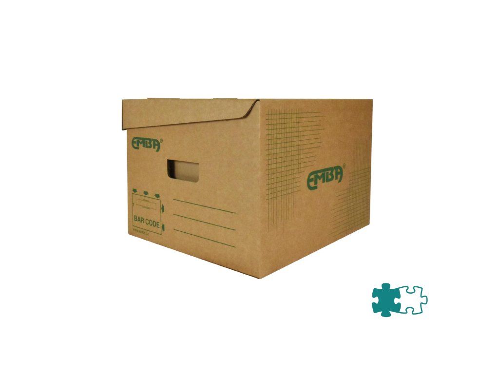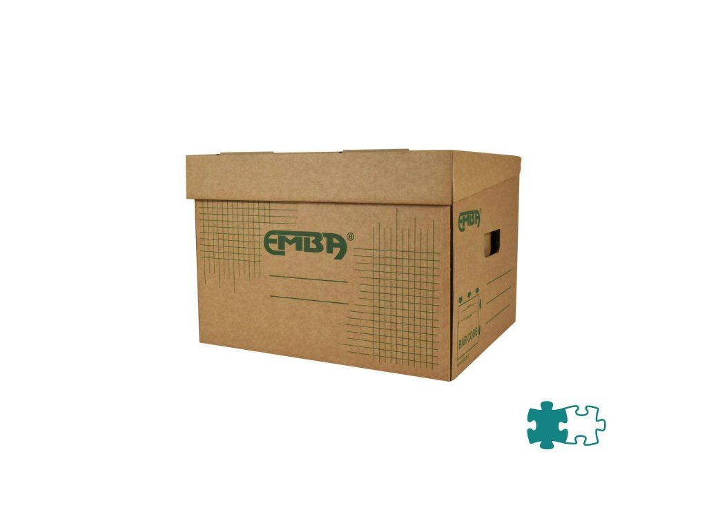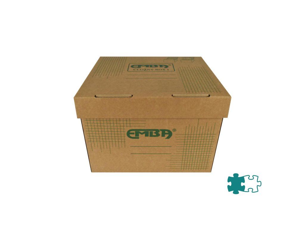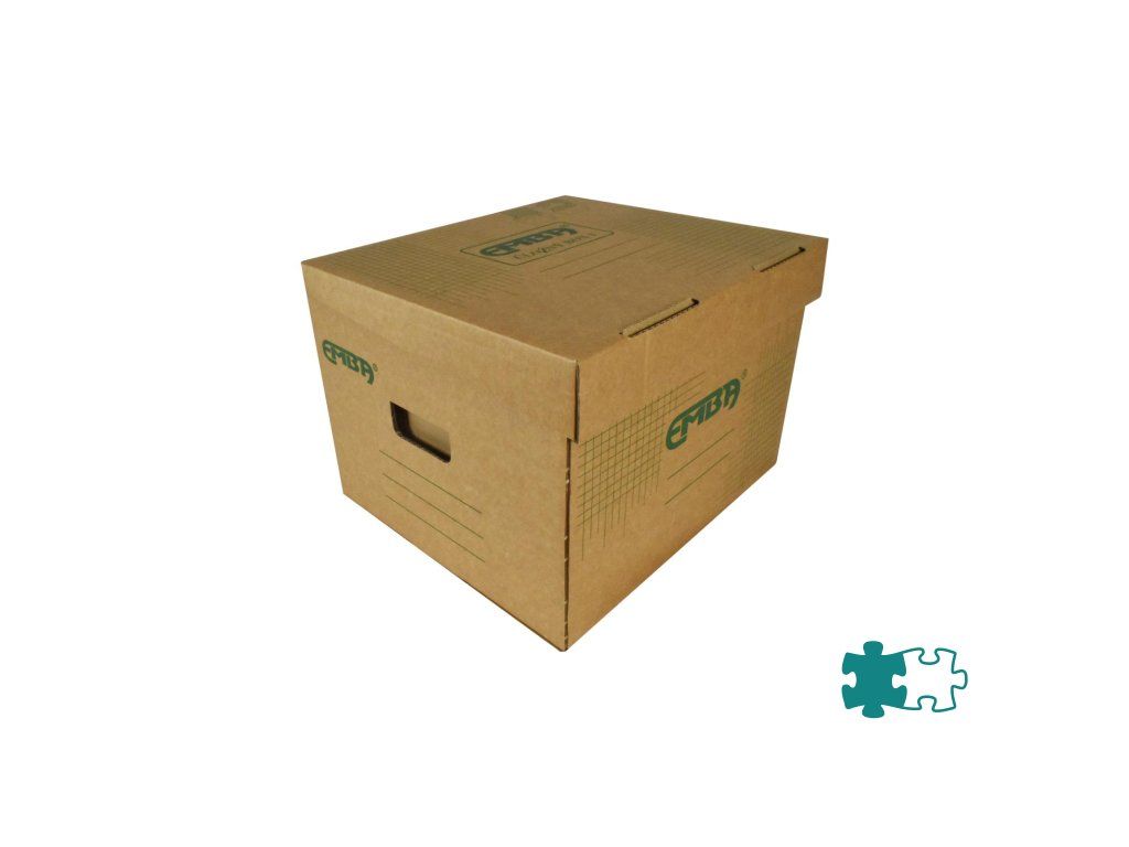Úložná škatuľa s výklopným vrchnákom z hnedej vlnitej lepenky so zelenou potlačou. Určená na uloženie voľne vložených spisov formátu A4. Rozmery š330xd300xv240 mm.Dodatočné parametre