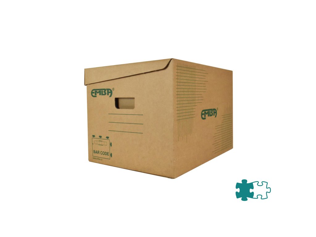 Škatuľa z hnedej vlnitej lepenky so sklápacím vekom a zelenou potlačou na ukladanie a archiváciu 5 zakladačov šírky 8 cm alebo archívnych boxov I/-75 mm. Rozmery (š x v x d) 425 x 330 x 300 mm. Nosnosť 100 Kg.Dodatočné parametre