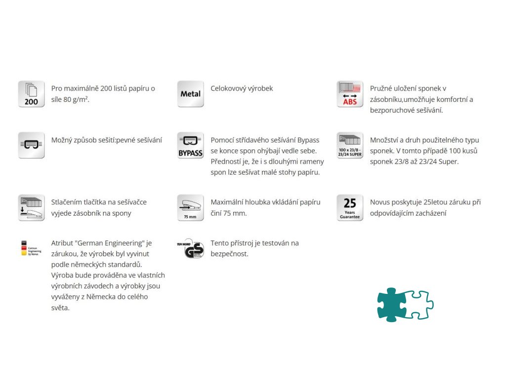 Extrémne silná celokovová veľkokapacitná zošívačka s plastovým telom. Kapacita zošívania do 210 listov, vybavená anti blokovacím ABS systémom pre bezproblémové zošívanie. Kovový zásobník s dvojitým vedením spiniek. Systém „bypass“ umožní použitie iba jednej veľkosti spiniek tým, že spinku ohne do bokov. Kapacita náplne 100 spiniek 23/ 8 až 23/ 24 SUPER. Variabilná hĺbka zošívania do 7,5 cm. Hmotnosť cca 2 100 g. Záruka 25 rokov. Farba sivá.Dodatočné parametre
