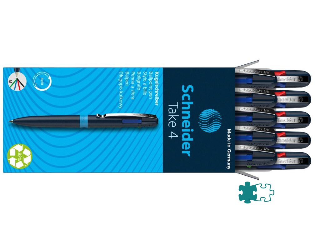 Štvorfarebné guľôčkové pero Schneider Take 4 s Viscoglide® technológiou pre hladké a kĺzavé písanieunikátne guľôčkové pero vyrobené z 92 % z recyklovaných plastov