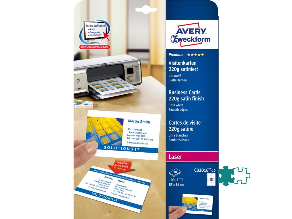 Vizitky s patentovanou technológiou QUICK & CLEAN™ pre ľahké vybratie z hárku. Kvalitný ultra biely papier na potlač 10 vizitiek saténovej úpravy veľkosti 85 × 54 mm z jedného hárku A4. Vhodné do laserových, farebných laserových tlačiarní a kopíriek. Farba ultra biela. Balenie 10 hárkov.Dodatočné parametre