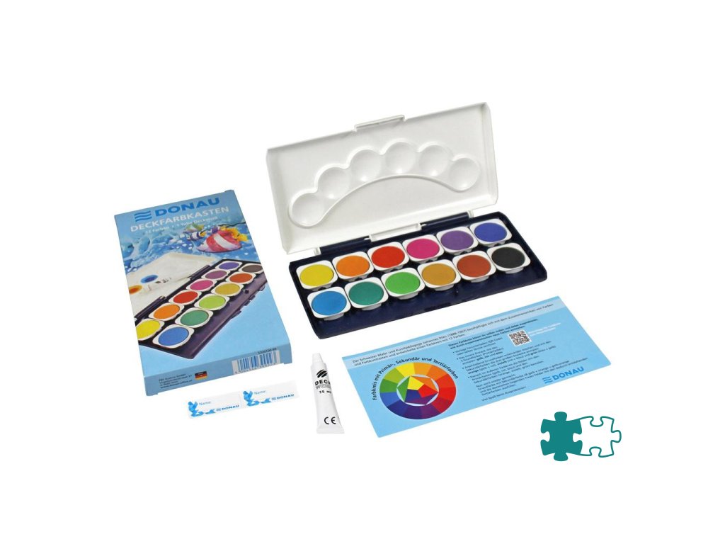 Vodové farby Donau, 12 farieb, vrátane nepriehľadnej bielej. Vyberateľné misky, paleta na miešanie farieb.Dodatočné parametre