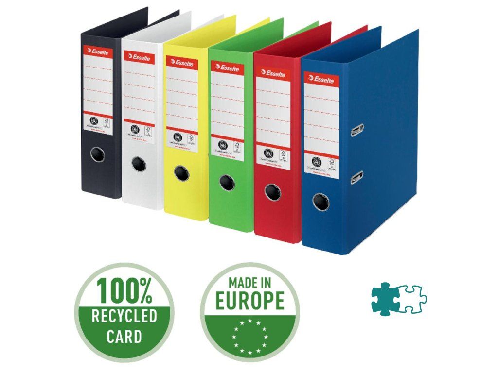 Kvalitný ekologický pákový zakladač vyrobený zo 100% recyklovanej lepenky, s ekologickými certifikátmi FSC a Blue Angel. Jedinečná mechanika No. 1 zaisťuje vynikajúci výkon. 75 mm široký a vhodný pre A4. Tento udržateľný pákový zakladač dokonale dopĺňa ostatné ekologické výrobky Esselte, ako sú kapsy a dosky z recyklovaného plastu. Koncept moderných a sviežich farieb v súlade s kolekciou Esselte Vivida, s dokonalým vzhľadom doma aj v kancelárii. Pákové zakladače Esselte zlepšia prostredie vo vašej kancelárii - aj prostredie na našej planéte.Kapacita 500 hárkov A4 (80 g/m2).