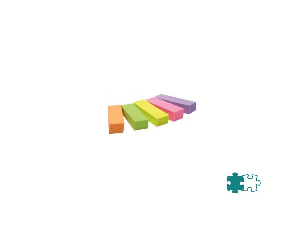 Papierové Post-it záložky bezo zvyšku odlepiteľné zo všetkých povrchov, viacnásobne prelepiteľné, rozmeru 15 × 50 mm. V balení 5 farieb: žltá, oranžová, bledoružová, tmavoružová, zelená po 100 lístkov.Farby: 5 farieb