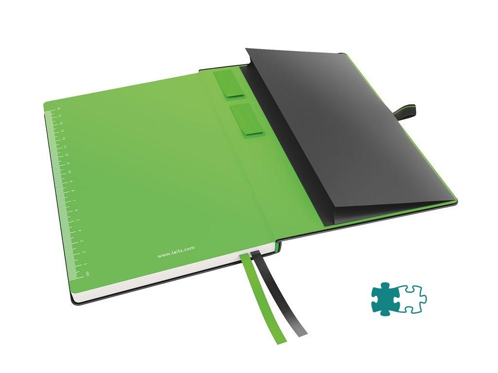 Zápisník s uzatváraním na gumičku s úchytom na pero a 2 textilnými záložkami. Posledných 8 strán perforovaných, samolepiace záložky na zadnej strane na označenie dôležitého obsahu, vnútorný obal s rozšíriteľnou kapacitou na prednej a zadnej strane na uloženie voľných listov. Materiál kožený vzhľad (syntetická koža). Formát A5.Dodatočné parametre
