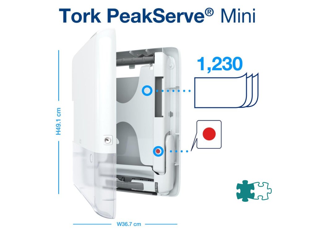 Tork PeakServe® najnovšia inovácia navrhnutá pre vysoko frekventované toalety a umyvárne, kde personál potrebuje maximalizovať čas upratovania a udržať dobrú plynulosť pre návštevníkov. Systém je kompatibilný s Tork PeakServe® nadväzujúcimi utierkami na ruky. Má vysokú kapacitu až 1 230 utierok, ktoré dokáže dávkovať rýchlo a plynulo bez prerušenia. Stlačené náplne sa rýchlo dopĺňajú a môžete ich kedykoľvek doplniť. Ľahko sa uskladňujú a prepravujú, vďaka čomu umožňujú personálu sústrediť sa na upratovanie a nie na dopĺňanie.Výška - 49.1 cm