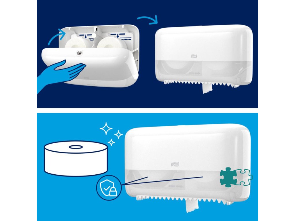 Tork Mid-size Twin zásobník na bezdutinkový toaletný papier je ideálny pre nízko až stredne frekventované toalety a umyvárne s vysokým dôrazom na spokojnosť zákazníkov. Zabezpečuje vysokú účinnosť a neustálu dostupnosť toaletného papiera pre hostí tým, že do neho možno vložiť deväťkrát viac papiera, ako sa nachádza na dvoch bežných kotúčoch.Kompaktný a úsporný dizajn vhodný do menších toaliet a umyvární