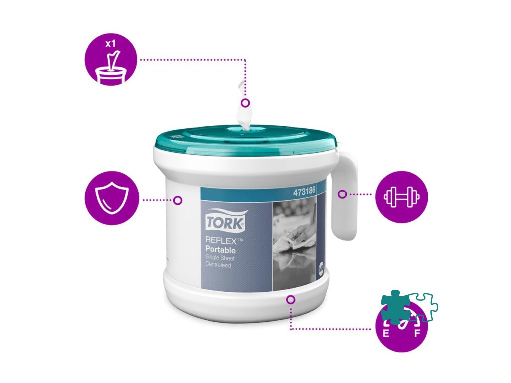 Zásobník TORK Reflex™ na jednotlivo dávkované utierky so stredovým odvíjaním je ideálny na utieranie rúk a povrchov pre profesionálne prostredie. Z dôvodu dávkovania po jednom útržku sa dotknete len toho, čo použijete, čím sa znižuje riziko krížovej kontaminácie a vďaka otočnému dávkovaču budete mať prístup k papieru z akéhokoľvek uhla. Tento jednoducho použiteľný, hygienický a odolný systém znižuje spotrebu utierok až o 37 %. Dodávame spolu s 1 bielym 2-vrstvovým kotúčom Reflex so stredovým odvíjanímMateriál: plast