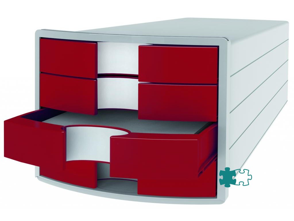 Box so štyrmi zatvorenými zásuvkami v tvare počítačového monitora.Rozmery (š × v × h) 294 × 235 × 368 mm.Farba boxu/zásuvky: sivá/červená