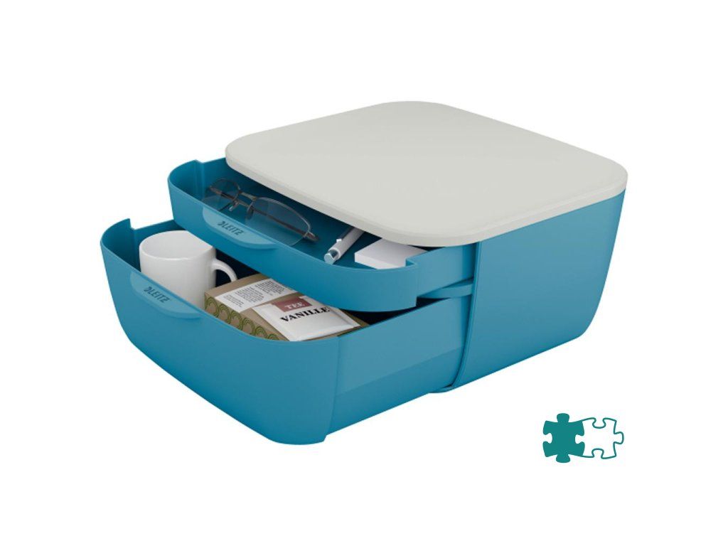 Značková kolekcia Leitz Cosy vám umožní cítiť sa ako doma, nech už vás váš pracovný deň zavedie kamkoľvek. Vďaka minimalistickému dizajnu a lákavej matnej povrchovej úprave pridáte svojmu pracovnému priestoru štýl a farbu. Zásuvkový box Leitz Cosy je ideálny na uloženie všetkých dôležitých vecí, ako sú písacie potreby, bloky a káble. Tento zásuvkový box prvotriednej kvality je perfektný doplnok vášho domova alebo kancelárie, pomôže vám, aby ste nestrácali čas hľadaním drobností a sústredili sa počas dňa na dôležitejšie veci. Zásuvkový box s 2 zásuvkami (1 malá a 1 veľká). Lákavé matné farby s minimalistickým dizajnom. Základňa boxu má veľkosť cca A4. Rozmery 251 x 143 x 275 mm. Farba modrá.Dodatočné parametre