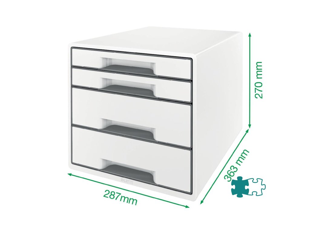 Box, dopĺňajúci produktovú radu Leitz WOW. Ľahko vysúvateľné 2 malé a 2 veľké zásuvky so zarážkou proti úplnému vysunutiu, jednoduché otváranie a zatváranie. Gumové nožičky pre lepšiu stabilitu, rozlišovač na popis zásuvky. Rozmery 287 × 270 × 363 mm. Farba červená.Dodatočné parametre