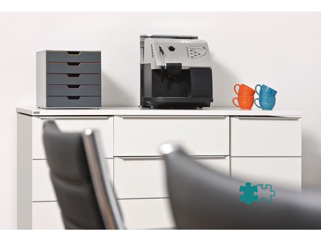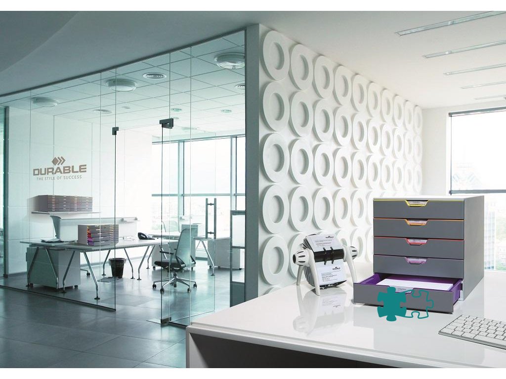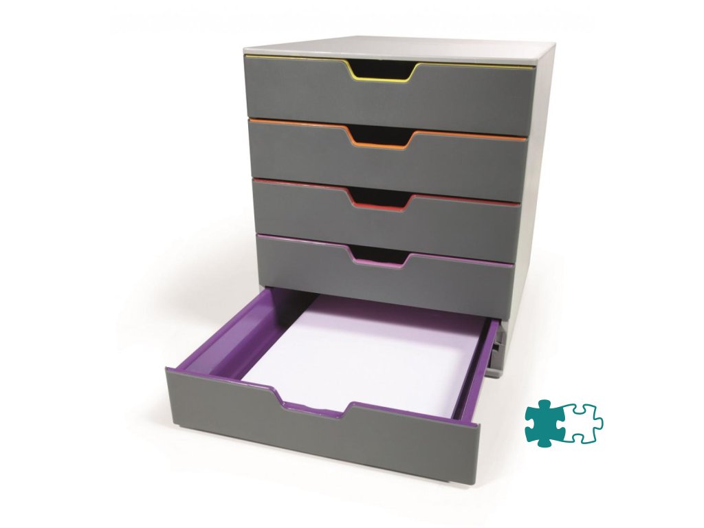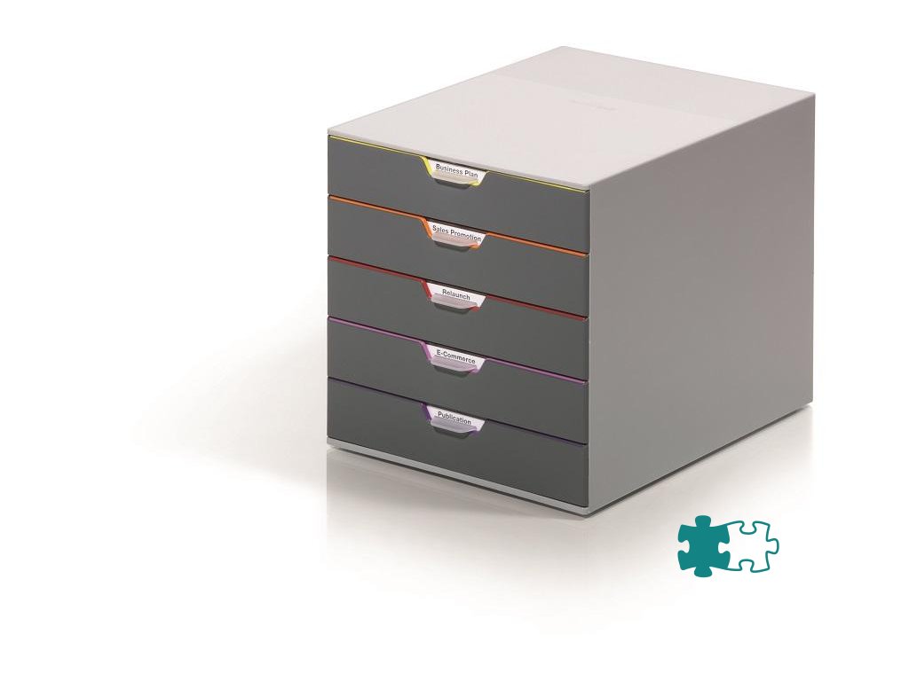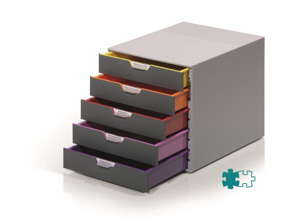 Boxy s 5 zásuvkami s vnútrami dúhových farieb dodajú kancelárii nádych elegancie. Pri ich zatvorení farebné línie iba jemne vystupujú z elegantnej sivej farby, pri otvorení sú žiarivé farby dúhy potešením pre oči. Dodávané s priehľadnými plastovými indexami na označenie obsahu. Boxy sú stohovateľné, zásuvky zabezpečené proti vypadnutiu. Materiál najkvalitnejší ABS plast, tichý a ľahký posun zásuviek, spodná strana s protišmykovou ochranou. Víťaz Product design award 2013. Rozmery (š × v × h) 292 × 280 × 356 mm.Dodatočné parametre