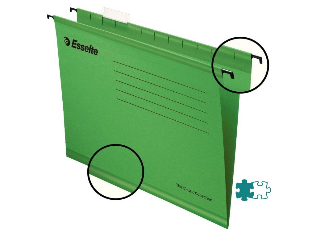 Závesné obaly Esselte kolekcie Classic vyrobené z pevného kartónu. Lisované dno obalu dovoľuje zvýšiť kapacitu na 30 mm. Súčasťou obalu je násuvný index z priehľadného plastu s výmenným papierovým štítkom. Formát A4, rozpätie vodiacich líšt 330 mm.Farba: jasná zelená