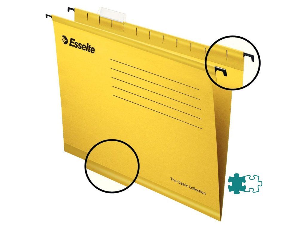 Závesné obaly Esselte kolekcie Classic vyrobené z pevného kartónu. Lisované dno obalu dovoľuje zvýšiť kapacitu na 30 mm. Súčasťou obalu je násuvný index z priehľadného plastu s výmenným papierovým štítkom. Formát A4, rozpätie vodiacich líšt 330 mm.Farba: jasná žltá