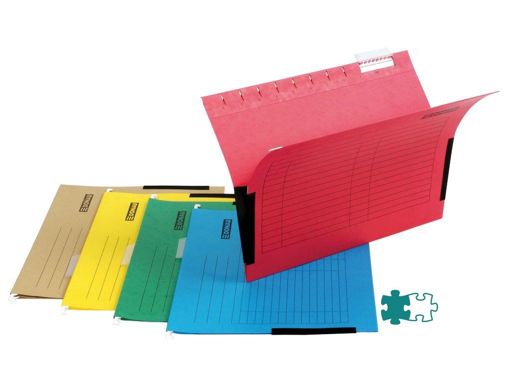 Závesný obal na zakladanie voľných listov do formátu A4. Plátené bočnice zabraňujú vypadnutiu dokumentov z obalov, kovové závesné háčiky garantujú dlhodobé používanie. Súčasťou obalu je plastový index a papierový štítok.Farba: červená