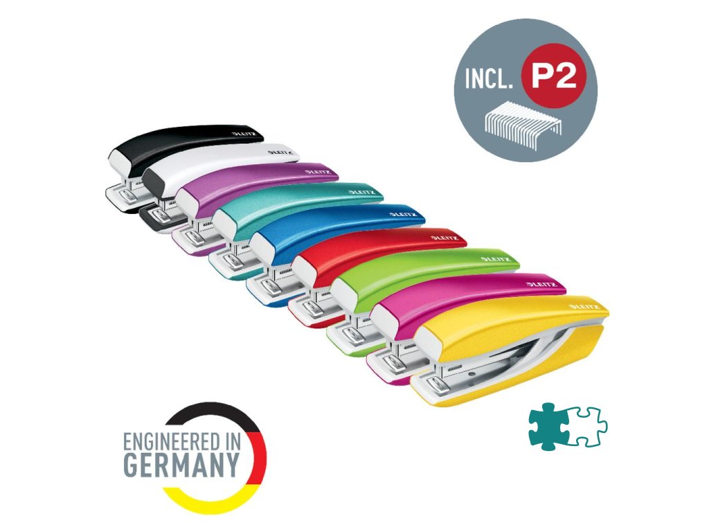 Malá zošívačka v moderných žiarivých farbách ideálna nielen do kancelárie, ale aj domov alebo na cesty. Vždy perfektné zošitie vďaka patentovanej technológii DIT. V kombinácii so spinkami Leitz Power Performance P2 (č. 10) dosiahnete vždy jednoduché a správne zošitie. Kapacita 10 hárkov. Vrecková zošívačka. Patentovaná technológia DIT na spoľahlivé zošívanie. Balenie v škatuľke, vrátane spiniek. Otvorením ramena o 180° je možné použiť nástenkové zošívanie (takrovanie). Farba červená.Dodatočné parametre