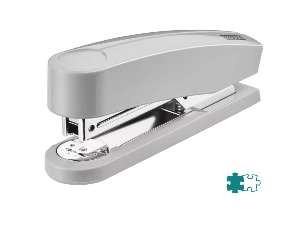 Ľahká zošívačka s kovovým zásobníkom a jednoduchým vedením spiniek. Kapacita náplne 100 spiniek 24/-6 alebo 150 spiniek 26/-6. Hĺbka zošívania 6,5 cm. Hmotnosť 175 g. Záruka 10 rokov.Farba: sivá