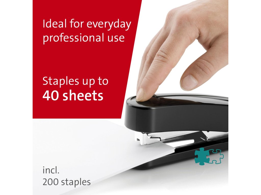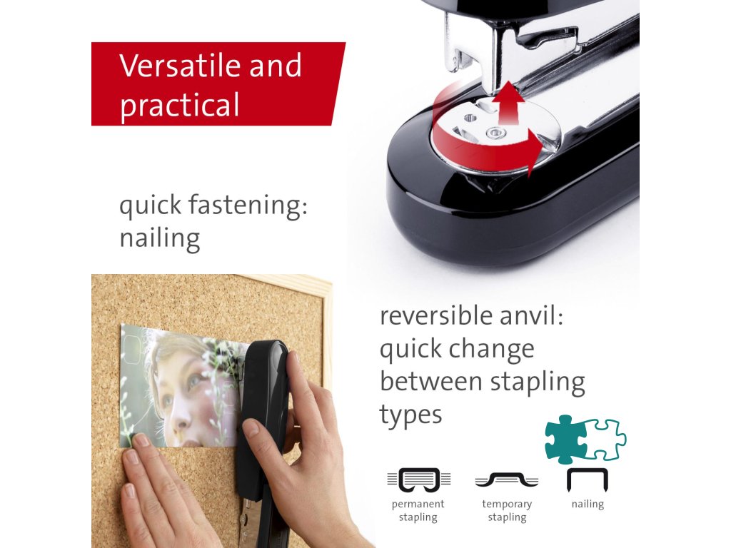 Kompaktná vysokovýkonná zošívačka v kovovom prevedení s plastovým vrchným dielom a dvojitým vedením spiniek. Kapacita náplne 100 spiniek 24/6 - 8 alebo 150 spiniek 26/6 - 8. Hĺbka zošívania 6,5 cm. Hmotnosť 245 g. Záruka 25 rokov.Farba: čierna