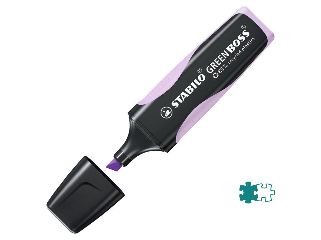 STABILO GREEN BOSS je zvýrazňovač vyrobený z 83% recyklovaného plastu pre školákov, študentov, učiteľov a kancelárskych pracovníkov, ktorí sú ohľaduplní k životnému prostrediu. Ekologický zvýrazňovač je k dispozícii v trendových pastelových a svetlých farbách! Technológia STABILO Anti-Dry-Out chráni pred vysychaním po dobu 4 hodín a zaisťuje koncentrovanú prácu. Značkuje a podčiarkuje v dvoch šírkach stopy 2 a 5 mm. Vďaka protišmykovej zóne úchopu leží bezpečne v ruke. Farba pastelová fialová. Väčšie balenie 10 kusov.- Zvýrazňovač vyrobený z 83 percent recyklovaného plastu