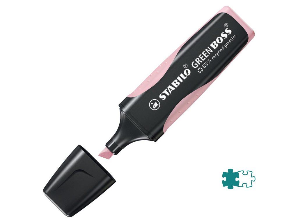 STABILO GREEN BOSS je zvýrazňovač vyrobený z 83% recyklovaného plastu pre školákov, študentov, učiteľov a kancelárskych pracovníkov, ktorí sú ohľaduplní k životnému prostrediu. Ekologický zvýrazňovač je k dispozícii v trendových pastelových a svetlých farbách! Technológia STABILO Anti-Dry-Out chráni pred vysychaním po dobu 4 hodín a zaisťuje koncentrovanú prácu. Značkuje a podčiarkuje v dvoch šírkach stopy 2 a 5 mm. Vďaka protišmykovej zóne úchopu leží bezpečne v ruke. Farba pastelová ružová. Väčšie balenie 10 kusov.- Zvýrazňovač vyrobený z 83 percent recyklovaného plastu